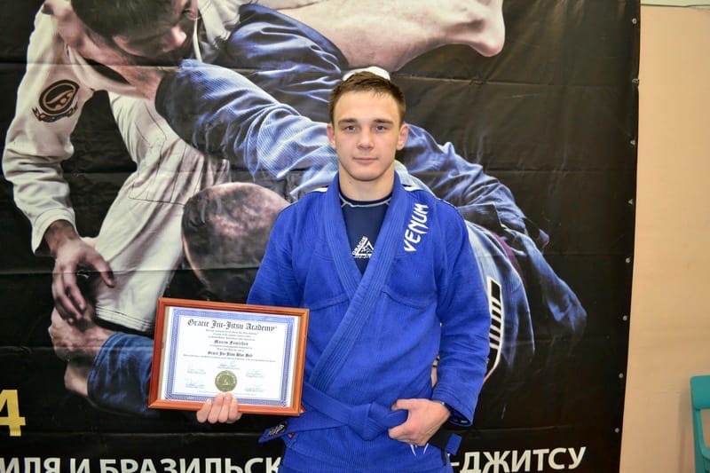 Онлайн академия Грэйси на тот момент многих привлекала возможностью получить пояс ONLINE, не покидая родной страны. Так и Максим получил свой первый пояс по бжж (синий пояс) ONLINE в 2013 году.